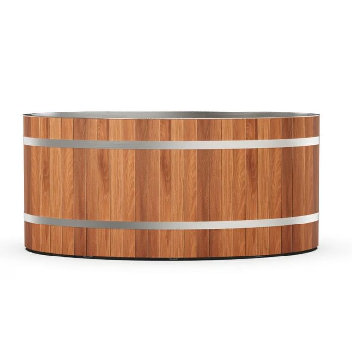 Answer 1: The hot tub is handcrafted using premium red cedar wood and durable stainless steel. This combination not only ensures longevity but also adds a stunning aesthetic appeal to your outdoor space.